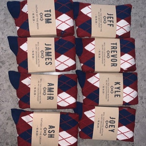 Personalized Groomsmen Socks for Weddings - Groomsman Gear Add Custom Name Labels All socks can be personalized with custom labels to include the names of your groomsmen, ushers, family, or any other wedding guests! Just check the "Add Personalized Label" option on the product page before checking out. Customer Reviews: Jessie "Absolutely perfect for our groomsmen!