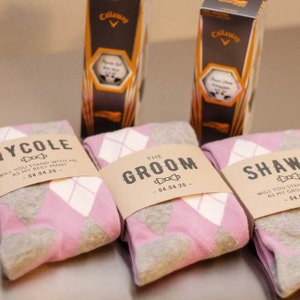 Groomsmen Socks | Groovy Guy Gifts All labels can be done in colors: White, Kraft, Cream or Blush. There are 2 types of labels - Wrapped around socks or Tag that is tied with twine rope. Labels are printed on heavy superior quality paper and grooved to wrap perfectly around socks. You can mix and match different colors or designs. Par-fect Socks He loves playing golf.